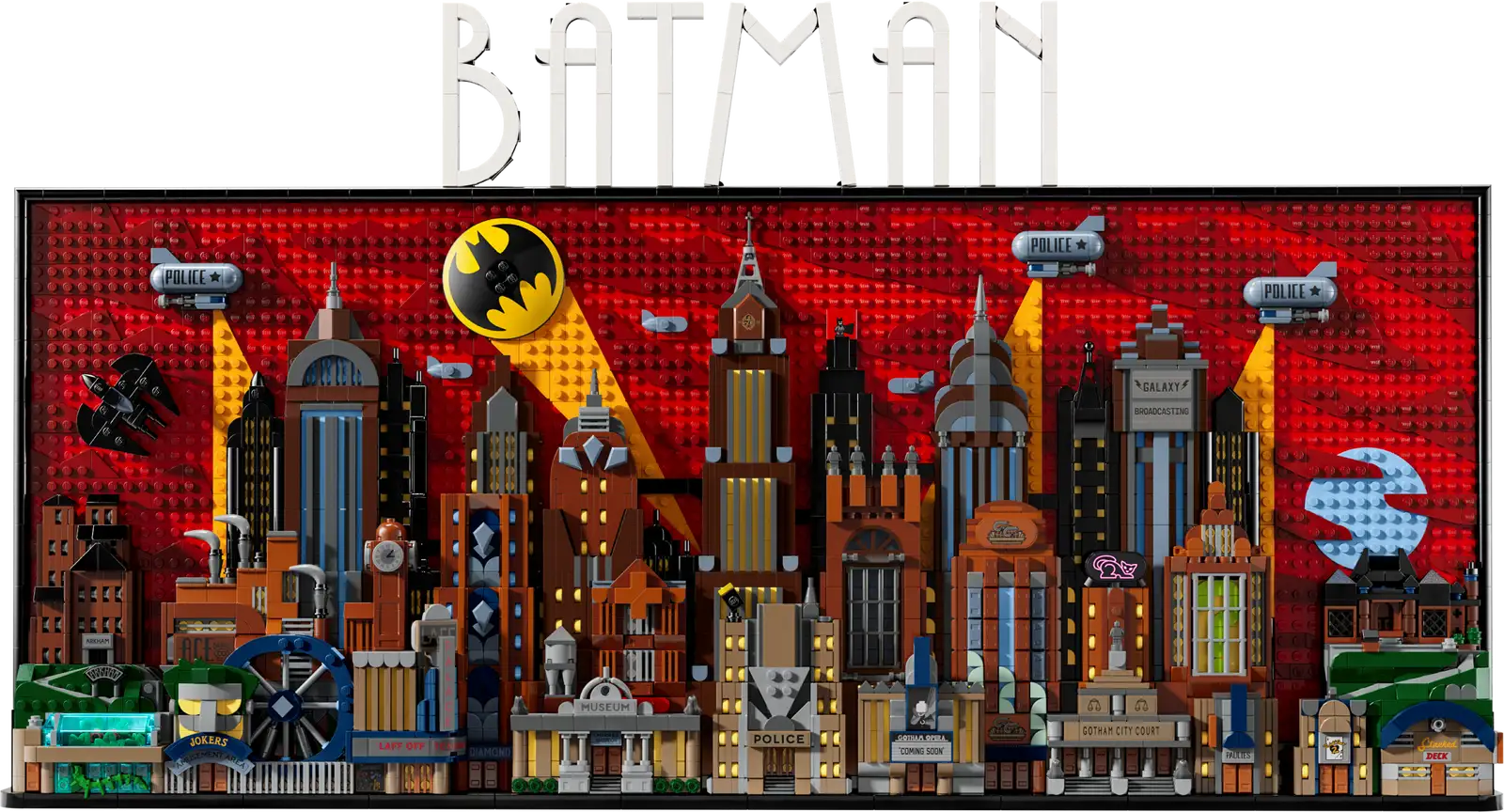 Questo sfondo costruibile di GOTHAM CITY di 4.210 pezzi misura 76 cm di larghezza. Incorpora 15 pannelli che possono essere rimossi per rivelare l’interno di Villa Wayne, della Batcaverna e dell’Arkham Asylum, e le attività di numerosi criminali di Batman: The Animated Series. Il set include anche 4 minifigure: Batman, The Joker™, Harley Quinn™ e Catwoman™ – e una Batmobile™ e un Batwing™ rimovibili. Il modello assemblato può essere montato a parete o esposto su scaffale o tavolo utilizzando un supporto estraibile. I 2 libretti di istruzioni per la costruzione inclusi consentono a 2 persone di lavorare sul modello contemporaneamente. Per maggiore comodità, è possibile trovare una versione digitale delle istruzioni per la costruzione del set nell’app LEGO Builder.